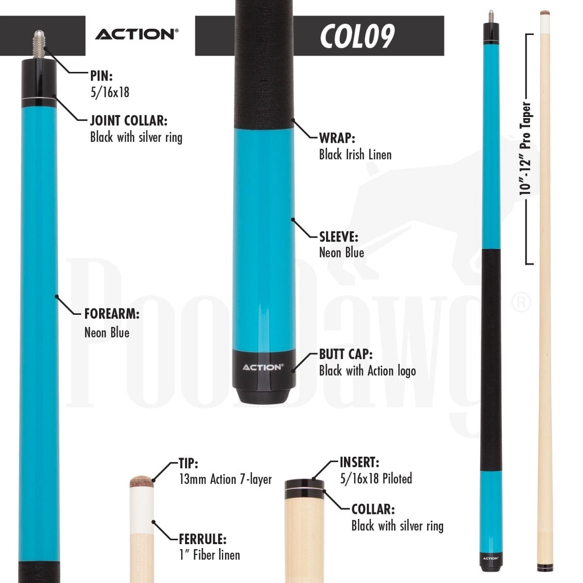 Neon blue! Prop Taper! Boarskin tip! Start developing some good habits by getting the COL09 Neon Blue Pool Cue! Subtle but loud. This is a great introductory cue. 5/16 x 18 is one of the most popular joints out there so upgrading later easy.