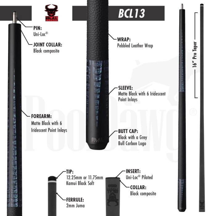 Get ready to take your game to the next level with the Bull Carbon BCL13 cue. This sleek and stylish cue features a matte black forearm and sleeve adorned with 6 iridescent point inlays that will turn heads as you dominate the table.