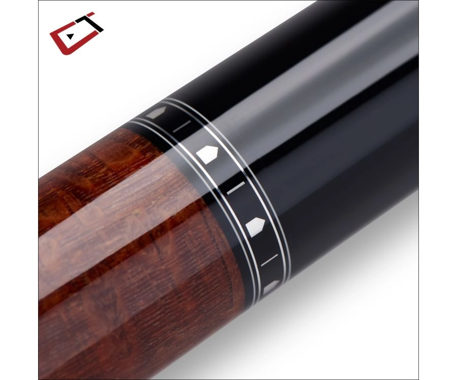 The leopard wood is the star of the show here. With a black forearm and sleeve, accented by metal rings, the highly figured wood in the handle really pops. Coated with an anti-vabration epoxy, and secured by a kiln dried maple core, this cue is built to last. With the included carbon fiber Cynergy shaft, you will be shooting as sharp as the cue looks.