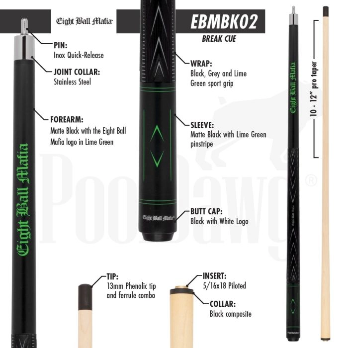Are you a heavy hitting breaker or are you looking to acquire a new break stick?! Check out the black and green matte finish break cue from Eight Ball Mafia! This break cue packs a punch – at 25oz. The phenolic tip and ferrule combo will allow all that power to pass right through the shaft and onto the cue ball. You will be blown away by the accuracy and power from the EBMBK02 break cue