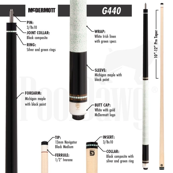 Elevate your game with McDermott’s high-performance G440 pool cue, meticulously designed to enhance your precision and control on the billiards table. With expert craftsmanship, this cue boasts a striking black w/ white square and Bocote ring design, combining elegance with functionality. The carefully chosen materials ensure exceptional playability, allowing you to achieve peak performance with every shot. The White Irish linen wrap, accented with subtle green specs, provides a comfortable grip that’s both stylish and functional. Unleash your skills and dominate the game with this exceptional black and white pool cue, where aesthetics meet unparalleled performance.