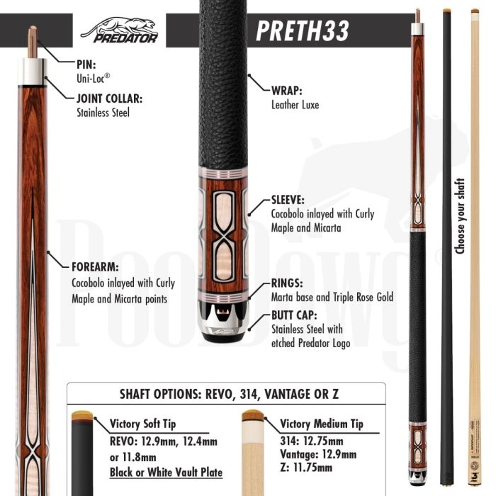 Enter a world of enchantment with the Predator cue, a marvel that dances with the magic of Cocobolo, Curly Maple, and Micarta. Behold the exquisite symphony of colors as Cocobolo intertwines with Curly Maple, their embrace invoking a sense of wonder.